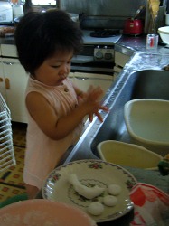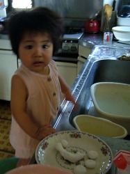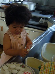 お盆の団子作りをするお母さんをお手伝い。 お仏壇やお墓にお供えします。