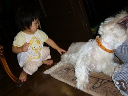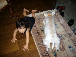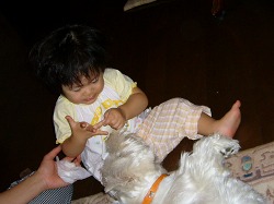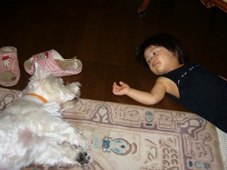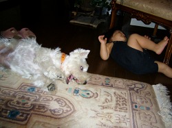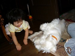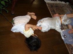 史織とポチは仲良しの兄妹みたいで、相手のカッコを真似るのが好き。 ポチが寝そべれば史織も寝そべり、史織が転がればポチも転がる。