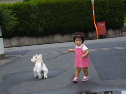史織がポチをリードしながら散歩。