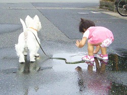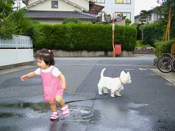 はしゃぎ回る史織と呆れぎみのポチ。