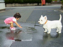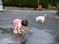 水たまりに歓声をあげる史織。