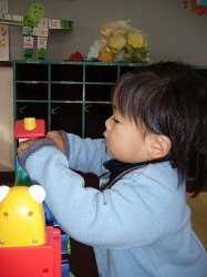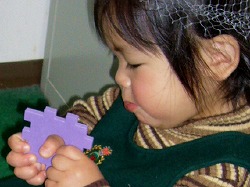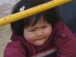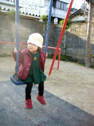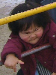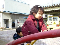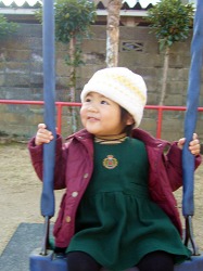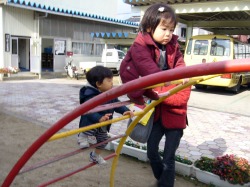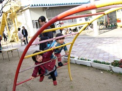 会が終わった後、園庭の太鼓橋で。 男の子たちが尻込みする中で女の子の史織はグングン登っていった。 他のお母さんたちがハラハラしながら傍らで見ているのに、史織のお母さんは安心しきって離れた所からカメラでパチリ。 恐いもの知らずは史織なのか、お母さんなのか、それとも2人ともなのか … それにしても男の子に負けまいと必死の形相で太鼓橋にしがみつく史織はスゴい。 この負けず嫌い根性と一所懸命さは史織を見習いたいと心から思う。