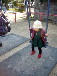ここの公園のブランコは、吊るしてあるチェーンや足元などに事故防止のために ポリウレタン材やゴム材が設置されているので他所の公園のものより少しは安心かも。