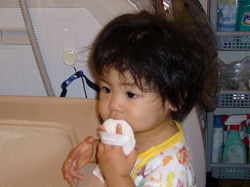 風呂上り、お母さんの化粧水用パフでいたずら中。
