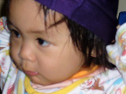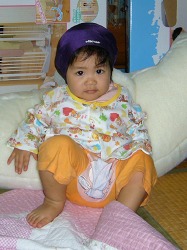 お母さんの水泳帽をかぶってご満悦。