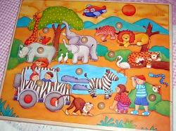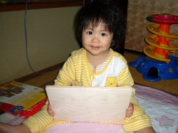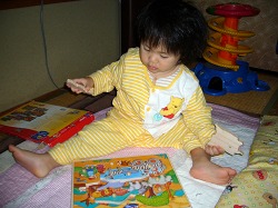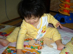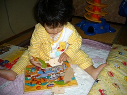 現在のところ、史織が好きな玩具のベスト3に入る木製ジグゾーパズル。 (お母さん方の)おばあちゃんに買ってもらった当初は見向きもしなかったのに 半月ほど前から飽きもせずに1日に何度も箱から取り出して遊んでいる。