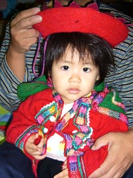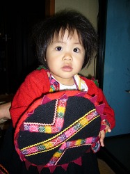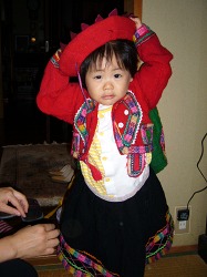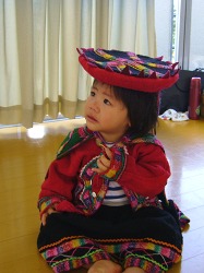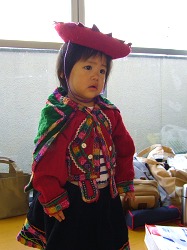 この民族衣装の子供服は1990年に南米のペルーを旅した際にマチュピチュ近郊で見つけ、あまりに可愛かったので思わず衝動買いしたもの。