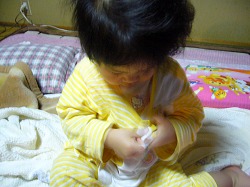 何となく成功しそうな気がしたのでカメラを構えて狙っていると かなり偶然っぽかったけどパジャマの第1ボタンが出来ました、1人で。