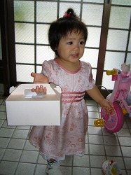 ケーキの箱を片手に、一番いいお洋服を着ておめかし。