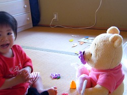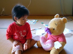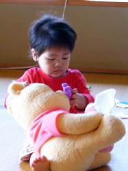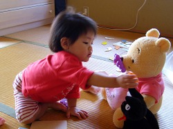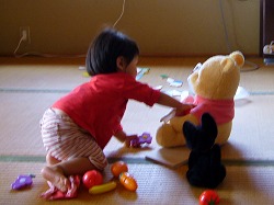 「ドドウ(葡萄)、どーぞ。」と言ってうなづきながら、プーさんに半分にした葡萄を食べさせている。