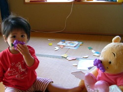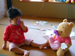 思いがけず、マジックテープで葡萄がプーさんの口にくっついたので大喜び。