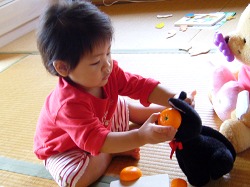 プーさんに葡萄がくっついたのに味を占めて、ジジにもオレンジがくっつかないかと四苦八苦している。