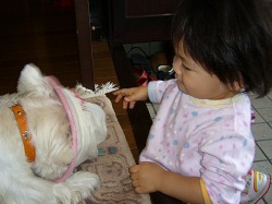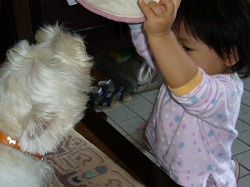 史織が自分の帽子をポチにかぶらせようとしている。