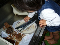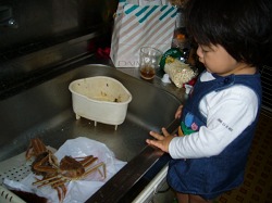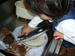 夕食のサンマと親ガニに興味を示す。