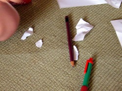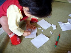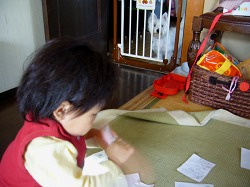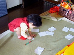 今日もお絵描きにいそしむ史織。 このところの史織のマイブームはお絵描き。 朝起きるとすぐに紙と色鉛筆を取り出すほどの凝りよう。 それにしても、米粒のような紙に描きたがるのはナゼだろう?