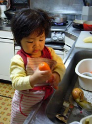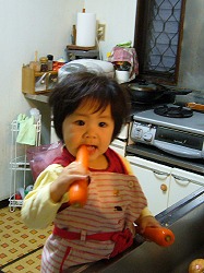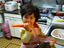 オモチャの人参をいつもかじって遊んでいるので 本物の人参もわざと口に入れてかじるマネをしている。 どうやら、こちらが心配して慌てるのを楽しもうというタクラミらしいので 「こらこら、駄目!」と引っ掛かったフリしてわざと大げさに慌ててみせてやる。