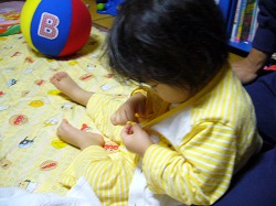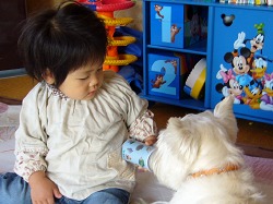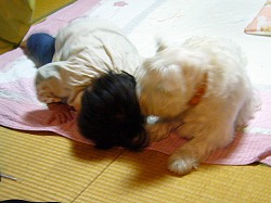 ポチがご挨拶に来ても固まったまま自分の世界に浸っている。