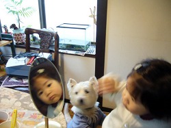 ポチもいっしょに覗きたいのに背丈が足りません。