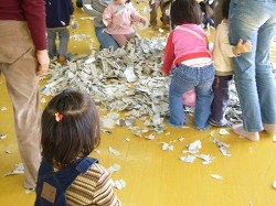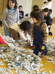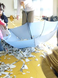 古新聞をビリビリと細かくちぎって裏返した雨傘に入れ、