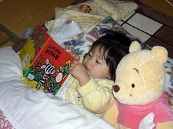 今夜は蒲団の中でプーさん相手に本の読み聞かせ。