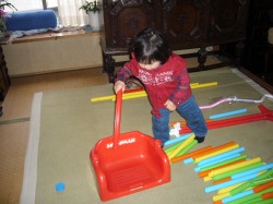 今日は、この毎日よく遊んでお世話になったジャングルジムを思い切って撤去。和室に置く予定だった雛人形をここに置こう。