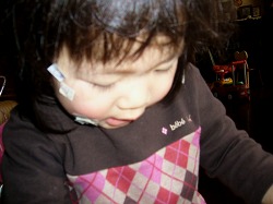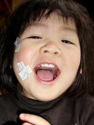 今日は顔にシールを貼っております。