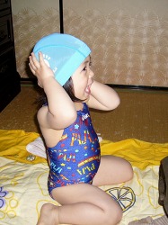 スイミングスクールも4月から上のクラスへ進級。 もうフリルやアニメが付いた赤ちゃん水着じゃなくてお姉さん風のスクール水着。 明日から始まる新学期に備えて家で新しい水着を着てみた。