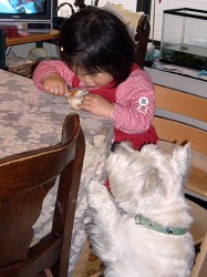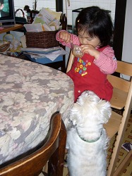 プリンを食べる史織。 ガリガリ引っ掻いてプリンをねだるポチ。 ポチに取られまいと急いでプリンをかき込む史織。