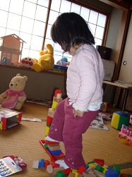 予想通り階段はバラバラ。 史織自身も充分判った上での確信犯。 何かを壊すことも面白くて仕方ないのはよく判る。 昔はお父さん・お母さんも怪獣ごっこで段ボールや積み木を よく破壊したものだ。