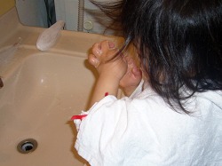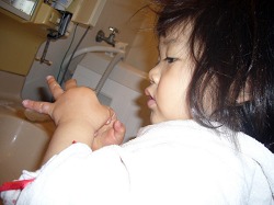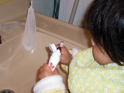 自分でブラシに歯磨き粉を付けて朝の歯磨き。